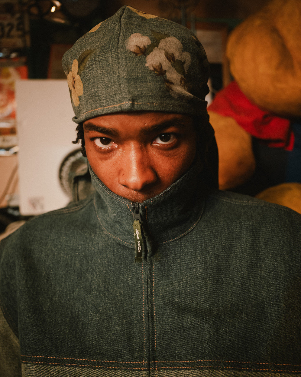 Completing the story: a cotton durag in all-over print and a photo-printed hat, each carrying the same intentional process that blurs the line between garment and artifact.