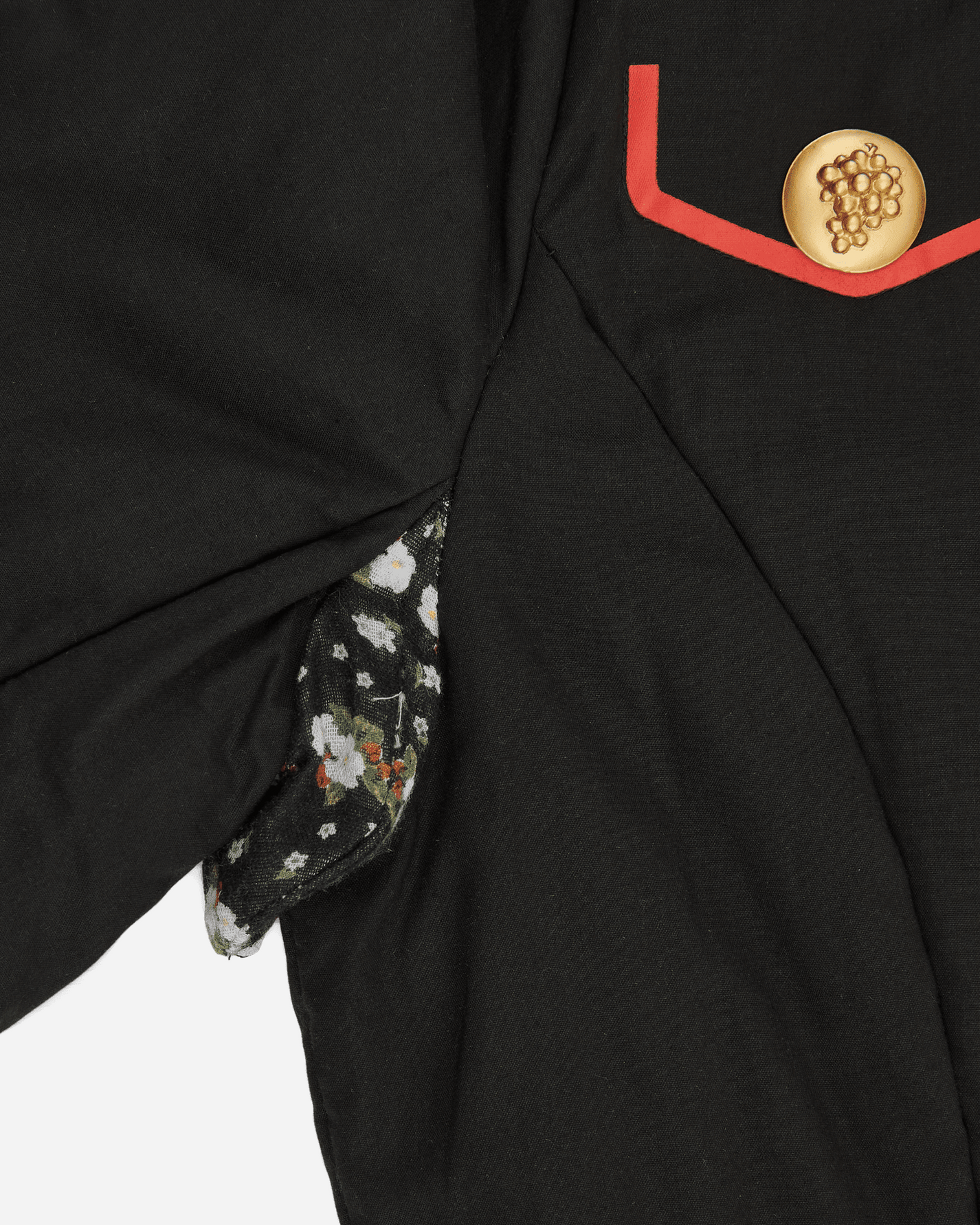 Red lining, golden buttons, extra armpit fabric, stitched details, two side zipper pockets.